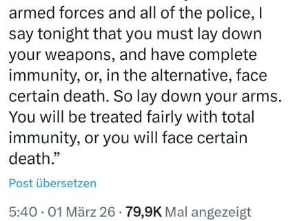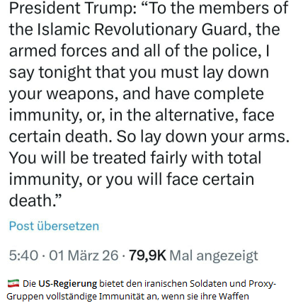 https://www.againstb.com/wp-content/uploads/2026/02/video_2026-02-28_10-14-37.mp4 An die Mitglieder der Islamischen Revolutionsgarde, der Streitkräfte und der gesamten Polizei richte ich heute Abend folgende Worte: Ihr müsst eure Waffen niederlegen…