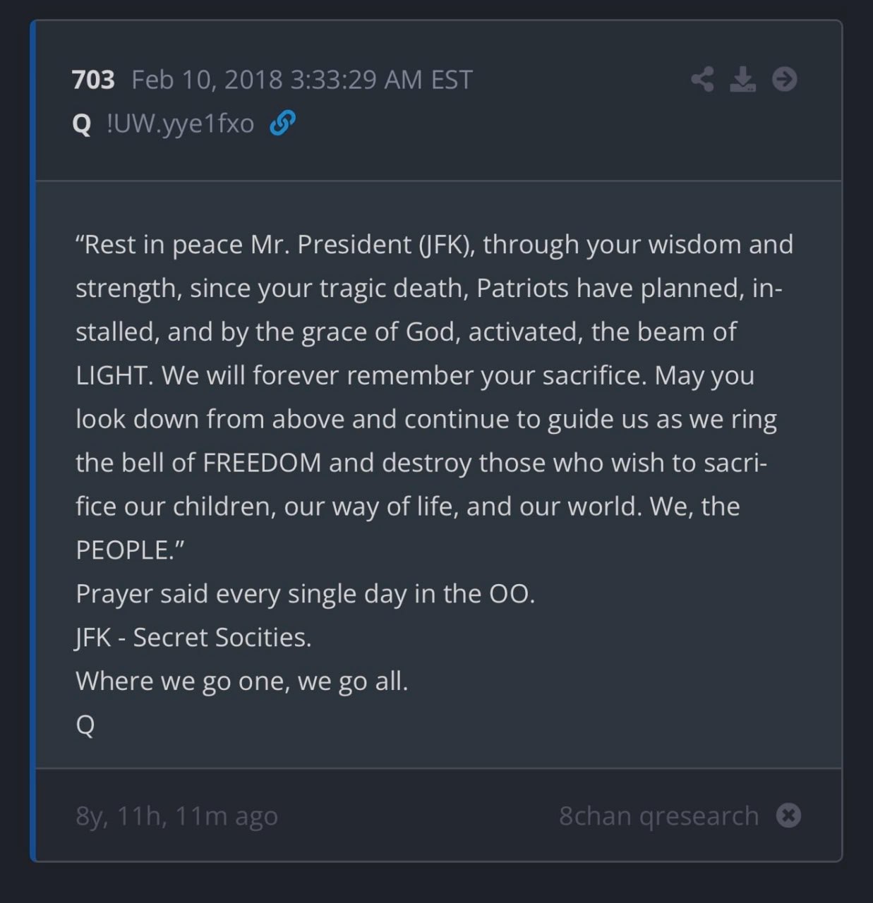 “Ruhe in Frieden, Herr Präsident (JFK), durch deine Weisheit und Kraft, seit deinem tragischen Tod, haben Patrioten den Strahl des LICHTS geplant, eingerichtet und durch die Gnade Gottes aktiviert. Wir werden uns für immer an dein Opfer erinnern. Mögest du von oben zu uns schauen und uns weiterhin führen, während wir die Glocke der FREIHEIT läuten und diejenigen vernichten, die unsere Kinder, unsere Lebensweise und unsere Welt opfern wollen. Wir, das VOLK.“