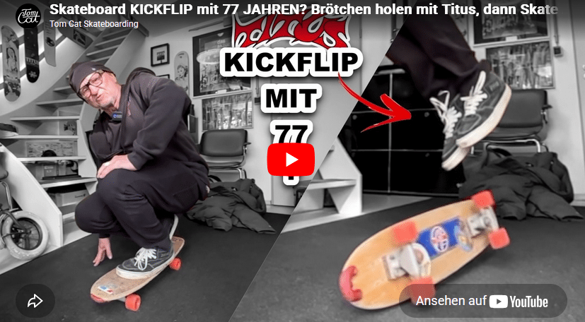 Kann man mit 77 Jahren noch einen Kickflip stehen? In diesem Video stellt sich Titus genau dieser Challenge – und glaubt mir, das wollt ihr sehen! Wir begleiten ihn bei seinem Versuch, den legendären Trick Oldschool Kickflip zu landen. Wird er es schaffen oder bleibt es beim Versuch? Danach geht’s weiter zu skate-aid, wo wir uns die neuesten Projekte und die aktuellen Modelle der Skate-Szene anschauen. Außerdem checken wir die freshen Vans-Schuhe und die stylischen Kollaborationen mit Skate-Legende Steve Caballero