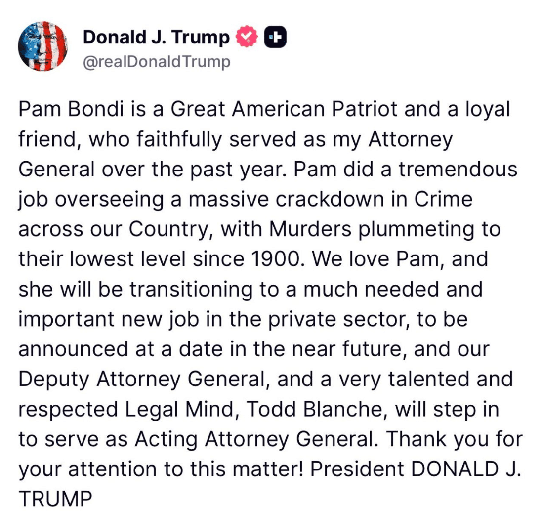 Originalstatement von Präsident Donald Trump zum Fall Pam Bondi!